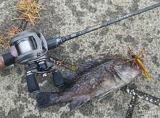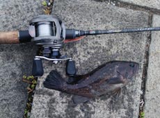 さらにルアーをラバージグにチェンジ!甲殻類系ワームをトレーラーで装着して同じようにブロックの隙間に落としこむとこの日最大の25cmのクロソイがヒットしました。