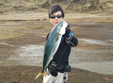 しばらくすると taku ちゃんにフクラギサイズのブリヒット!表層付近のスイミングパターンでゲット!ヒットルアーはカルティバ・撃投ジグエアロ60g。