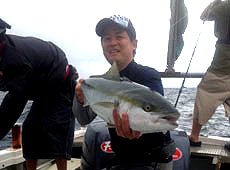 8月17日、オフショアのブリジギングに行ってきました!早朝5時、戸井より出船。10分ほどでポイントに到着。ネイチャーボーイズ・鉄ジグスイムライダー200gをセットしジャーク開始!しばらくするとフォール中にヒット!ドラグが止まらず大型の予感!?ワクワクしながら寄せてくると、見えてきたのは魚の尻尾???何とフックが尻尾にスレ掛かり。通りでファイトが強いと思いました(汗)サイズは5 kg ちょっとのサイズ。スレでも嬉しい1匹でした!その後、岡クラフト・ボトムフラッパー180gで2匹追加!シャクリ過ぎて腕がパンパンになりながらもブリをゲットでき大満足の釣行となりました。