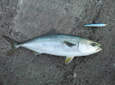 次はシンキングペンシルにチェンジ。キャスト後、ボトム付近まで沈め、潮の流れにのせながら時折アクションを加え、ルアーを一定の場所に止めて回遊を待つ作戦!