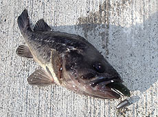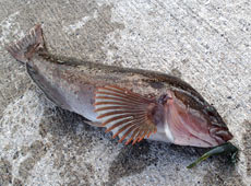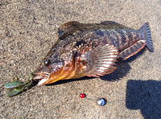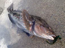 噴火湾方面へアブラコ(アイナメ)狙いで行ってきました。まずヒットしたのはハゴトコ(スジアイナメ)!エコギア・バグアンツ2インチのテキサスリグでボトムをズルズルっと引いて一点シェイクを繰り返してのヒット!