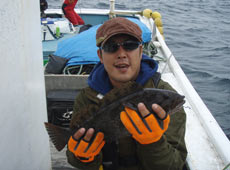 10月13日椴法華でボートロック!午前8時に椴法華漁港より出航。ポイントに到着すると、潮の流れが早く底が取りにくい状況の中、見事ファーストフィッシュは広島県から北海道遠征釣行にいらっしゃった小田さん!40アップアブラコ(アイナメ)ゲット!