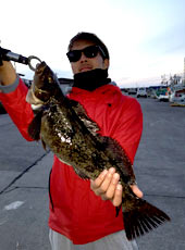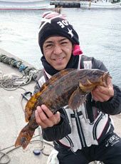 遠投で沖目の魚を狙っていた友人には49cmのアブラコ(アイナメ)!ヒットルアーはノリーズ・リングマックスバス!