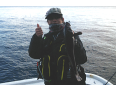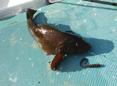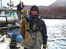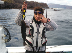 中澤さんはパルスワームでボトムを丹念に探りアブラコ(アイナメ)ゲット!