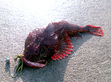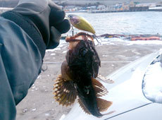 気を取り直して今度はクランクベイト(ノリーズ・ショットオーバー5)を岸壁際にキャストしてグリグリ巻いてくると”もぞ〜”っと重くなりカジカがヒット!クランクベイトで初めてのカジカヒット!