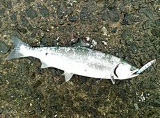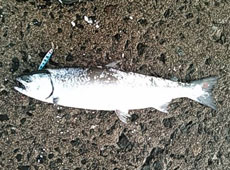 夜が明け、明るくなってきた頃に沖から鳥山が近づき、堤防の外で狙っていたアングラーにサクラマスがヒット!次第に鳥山が消えていくと、今度は港内で狙っていたアングラーにヒット!サクラマスの群れが港内に入ってきた様子!