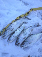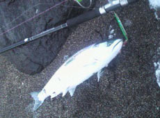 朝イチからメタルジグで狙っているとリトリーブ中、「プルプル」と魚信。上げてみると10cm位のコナゴ。近くでは小型の海鳥が騒いでおり、ベイトの気配が濃厚! 海鳥の近くに岡クラフト・LT−30をキャスト!着底後のジャーク&フォールでいきなり「ガツン!」キャッチしたのは今期初の43cmのサクラマス! その後、反応が無く同じポイントでキャストを続けていると、今度はリトリーブ中に「ガツン!」2匹目の45cmゲット!そこからは怒とうの3連発!!52cm、45cmと連続ゲット! ヒットルアーは全てLT−30でした!3投連続ヒットにシビレました!!