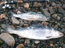 早朝6時サーフに入釣。風は無風で適度な波具合と絶好のコンディションの中釣り開始。離岸流の発生しているポイントにて、岡クラフト・岡ジグLT−35のジャーク&フォールで狙っていると、フォール中に突然ひったくられヒット!キャッチしたのは51cmのサクラマス!まだ薄暗い状況の中でのヒットでした。その後間もなく2匹目がヒット!もしや爆釣の予感!?が・・・その後風が強くなり惜しまれつつも終了。朝のワンチャンスが貴重な釣果となりました。