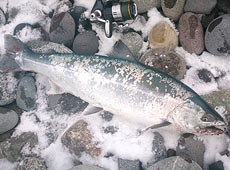 早朝からサクラを探して場所を転々とするも反応は無し・・・周りでも釣れている雰囲気がない・・・そんな中でたどり着いたサーフで海鵜が頻繁に潜っている姿を発見!もしかするとベイトになる魚がいるのかも?と思い、岡クラフト・LT40を沖目に遠投して高速で巻いてくると一投目で「ガツンッ!」と強烈なバイト!上がってきたのは55cmの良型サクラ!さらに同じ場所へキャストし、同じように高速で巻いてくると40cmのサクラがヒット!この日は諦めかけていただけに、嬉しい釣果になりました。これで2週連続のサクラゲット!3週目もこの好調が続くように頑張ります!