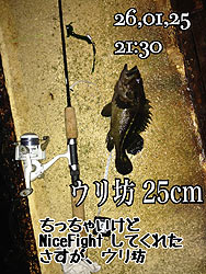 今夜は一人でランガン!漁港に到着!さっきまで風も穏やかだったのに、やや吹き始めてしまいました(寒) 私は堤防から外海にエイヤ〜とCastするも、風のため底も取れず(汗) 内側に移動…んっ?根がかった?いや、キタヨ〜!来ましたよ〜!NiceFightデス\(^o^)/先日のソイと同じく、何度もツッコミしてくれました〜 ゆるゆるドラグ締めなが5lbLineでも、ブレイクされる不安も無く、引を満喫!! やって来たのは、ガッツあるウリ坊(シマゾイ)!!!いや〜!満足!満足!