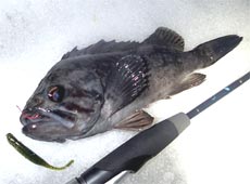 その後は反応が無く・・・ネイルシンカーを0.8gに落としてさらにフワっとフォール作戦!着水後にラインを送り込み、底付近でラインのテンションをゆっくりと張ると竿先に重みが!そのままロッドをゆっくりあおるようにフッキングすると、ロッドが大きく曲がりました!良い引きを見せ上がって来たのはクロソイ!ヒットルアーはエコギア・ミノーS!