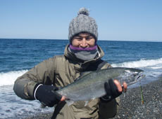 その後もポイントを移動しながらラン&ガン!あきらめずキャストしていると近間さんにヒット! 沖で「ギラギラ」と暴れるサクラマス!緊張の瞬間でしたが慎重にやり取りしランディング!キャッチしたのは54cmとナイスサイズ!待望のヒットに2人でガッチリと握手!最後を締めくくる1匹となりました!