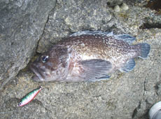 ルアーを AT −30にチェンジ。リフト&フォールに反応が無くなったのでスイミングで狙ってみると「グッ」と重量感のあるバイト!ヒットと同時にボトムに向かってジリジリと突っ込む力強いファイト!突っ込みに耐え、ポンピングで一気に浮かせると浮いてきたのは良型のクロソイ。