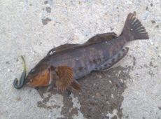 数投するも反応が無いため、ヘチ際を狙ってみることに。するとすぐに反応がありアブラコ(アイナメ)ヒット!ヒットルアーはノリーズ・パドチュー。