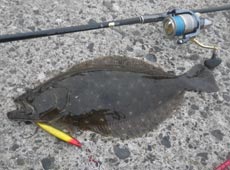 メタルジグでの反応がなかったのでスプーンジグにチェンジ。ストップ&ゴーで狙っているとリトリーブ中にヒット!44.5pのヒラメゲット!