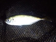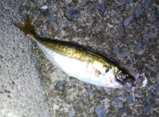 さっそくアジング&エギングの2タックルを用意し釣り開始。まずはアジから狙います。台風の影響が不安でしたが、すぐに魚からの反応があり不安は一気に解消。次のバイトに集中しながらリトリーブすると次のバイトでフッキングがきまりヒット!キャッチしたのは15 cm ほどのアジ!ヒットルアーはバークレイ・ガルプSWベビーサーディン2インチ。