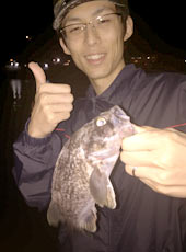 今回が釣りを始めて3回目の沖田さん。 赤塚さんのレクチャーを受けてクロソイゲット!先生より先に釣れた!(笑)