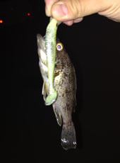 甲殻類系で底を狙っていると数は釣れるものの中々サイズが上がらないので。エコギア・バルト3.5インチのリフト&フォールを試してみると・・・よくこのサイズのワームに食いついたと思うほどの小型のクロソイがヒット(笑)