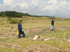 釣査終了の12時になりメインとなる豊津海岸の清掃。空き缶、空き瓶、ペットボトル、燃えるゴミを皆さん熱心に拾いました。これからもずっと綺麗な釣り場であり続けることを願い、清掃活動を終了しました。