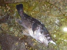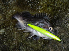 仕事帰りに知内方面にソイ釣りに行ってきました!最初に入釣したポイントは磯場。まずは広範囲を探るためシンキングペンシルをセット。表層からボトム付近を隈なく探ると、ボトム付近でヒット!キャッチしたのは20cmほどのクロソイ。