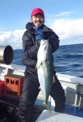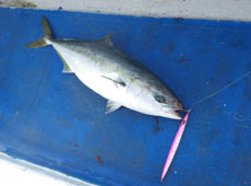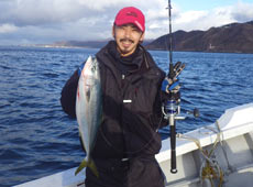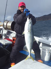 しばらくすると岡さんのロッドが大きく曲がり良型の予感!慎重にやり取りし上がってきたのは8kgほどのブリ!ヒットルアーは岡クラフト・ボトムフラッパー。