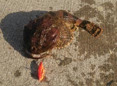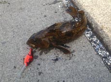 その後も同じパターンで探り続けていると、今度はボトムで「グッ」と抑えこむバイト!特有の重量感で浮いてきたのはカジカ!