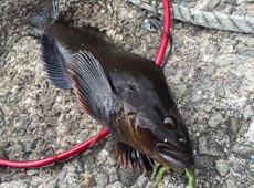 風が強くなり次の漁港へ 船の裏側にキャストしボトムをシェイクしながらリーリングすると鋭いバイトが! なかなかのファイトで上がってきたのは40UPのアブラコ(アイナメ)!