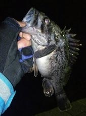 ポイントを移動し、ゴロタ場で釣りを再開すると、目の前でボイル発生!そこにルアーを通すとお腹パンパンのクロソイがヒット!ベイトフィッシュ系ワームでの反応が良かったです!