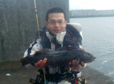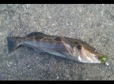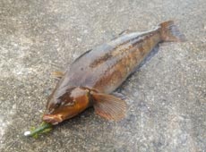 下海岸側へアブラコ&カジカを狙いに行ってきました!目的の漁港に到着すると偶然たじま君と遭遇!一緒に釣りをすることに。最初に港内を狙ってみるもいまいち反応が無く、漁港の先端付近に移動。14gテキサスリグにバークレイ・パワーバルキーホッグ3インチをセット。沖目にフルキャストしリフト&フォールで狙います。広範囲にキャストして探っているとリフト中に「グッ」と重量感を感じフッキング!それほど走らずすんなりと寄ってきたのは予想外の良型!キャッチしたのは46cmのナイスサイズのアブラコ(アイナメ)!