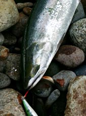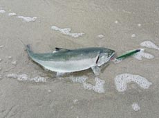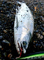 サクラマス狙いでサーフに入釣。 先行者が10人ほどいましたが、次々に帰り始め、サーフは貸し切り状態。 そんな中、シマノ・カーディフモンスターリミテッドウインドリップ95AR−Cをキャスト。 ミディアムリトリーブで探っているとさっそくヒット! 小型でしたが今期初サクラゲット! その後、釣ってはリリースを繰り返し、10本以上のサクラマスゲット! そのほかバラしを含めると数知れず。 次はサイズアップを狙います!