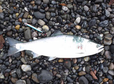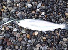 すると自分にもサクラマスらしきアタリが!残念ながらヒットまで至らず・・・そしてルアーを岡クラフト・LT30にチェンジしての数投目に待望のヒット!久々のサクラマスの引きを味わいながらランディング成功!46cmのサクラマスでした。