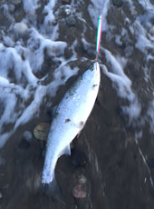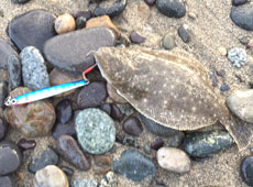 車を走らせポイントを探しているとアングラーが全くいないエリアを見つけ入釣。さっそく1投目から魚の反応があり、期待十分な状況!ドキドキしながらの2投目、中層付近を意識したリトリーブで狙うと、すぐにヒット!サクラマスゲット!それからは1時間ほどの間ヒットが連発!!さらに時合が終ってからもポツリポツリとヒットは続き、結果なんと8匹のサクラマスをゲット!しかもソゲサイズのヒラメのおまけ付き!