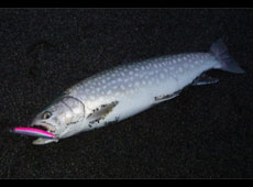 スミス・ハルカ125Sのアピール系カラーをキャスト。波が高めなので、水噛みを意識しながらスローリトリーブで狙うと、「ガツン」とヒット!トルクのあるファイトで楽しませてくれたのは50アップのアメマス!