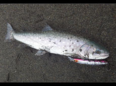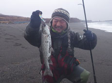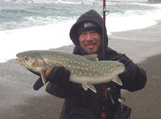 海アメマス調査会終了後に再び出撃! 最初に入ったポイントは波もほどよく、アメマスもサクラマスも釣れそうな雰囲気。しばらくすると小佐にヒット!キャッチしたのは61 cm のアメマス!ヒットルアーはスミス・ハルカ145F。