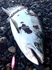 今度は小さめのメタルジグに変え、波打ち際に対してほぼ平行にキャスト!ミディアムリトリーブで巻くと1投目で「ゴンッ」と力強いあたり!