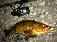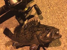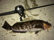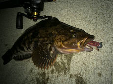 自分も11gジグヘッドにエコギア・グラスミノーL の組み合わせでボトム付近をスイミングで狙うとヒット!キャッチしたのは40アップのアブラコ(アイナメ)!