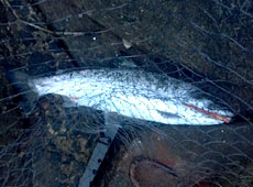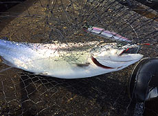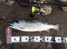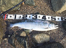 その直後沖目でグッグッ!と竿先が入るが乗らず。その後はモジるサクラマスを横目に投げ倒すがノーバイト。タイムアップも近づき、ルアーをシマノ・ウインドリップにチェンジし、ラスト 3 投勝負。1投目 2 投目アタリ無くラスト1投目、力んでキャストが乱れる(笑) これでは締まらないと泣きの1投でミラクル!何度も首を振るイヤなファイトでしたが無事ゲット!