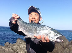 サクラマス狙いで朝から海峡方面のポイントを転々としましたが、魚の反応はなく・・・ 時間が午後3時を過ぎた頃、風をかわす場所を探して磯に入りました。