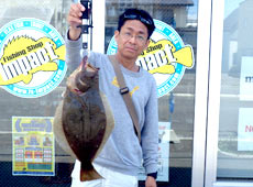 またルアーを戻して数投目!駆け上がり付近で根がかりのようなアタリ!根につかないよう、頑張って浮かせてネットイン。50.5cm、1.41kgのヒラメでした。