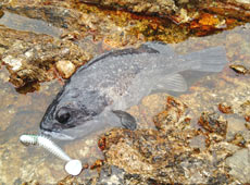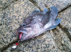 小野さんにヒットしたのはアブラコ ( アイナメ ) !コンディションが良くサイズ以上のファイトを見せました!ヒットルアーはバークレイ・パルスクロー3インチ。