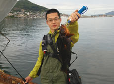引き続き埠頭をラン&ガン!テンポよく探っていくとたじま君に再びヒット!1匹目と同サイズのアブラコ(アイナメ)!日が差してきたのでカラーを紫外線発光系にチェンジしたらヒットしたとのこと。