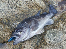 続いて小野さんはアブラコ(アイナメ)ゲット!ヒットルアーはダイワ・鮃狂ダックフィンシャッド3.5インチ。