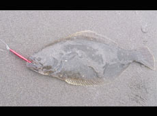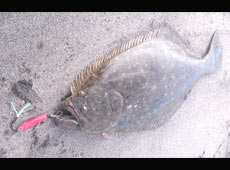 手前で手こずりましたがなんとかサーフにずり揚げました。キャッチしたヒラメは66.5cm!