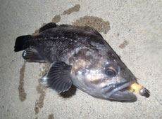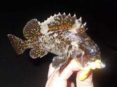 赤塚君が先に帰り、日もすっかり暮れたのでハチガラ狙いにチェンジ!1.8gのジグヘッドにエコギア・バグアンツ2インチをセット。岸壁際スレスレを落としこんでいくと小型のハチガラ(オウゴンムラソイがヒット!