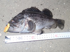 一度探った場所をマルキュー・パワークラブLに変えて探り始めると・・・1投目で30cmジャストのハチガラ(オウゴンムラソイがヒット!