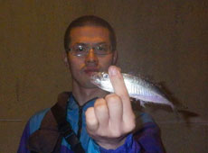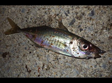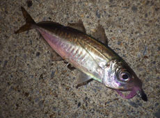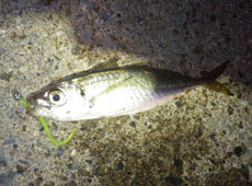 0、8gジグヘッド+バークレイ・バブルサーディン2インチをセット。 表層には大漁のイワシの群れがいるため、イワシの層より下の層をチェック。 小刻みなリフト&フォールを繰り返しているとフォール中に小気味よいバイト! キャッチしたのは15cmほどのアジ。