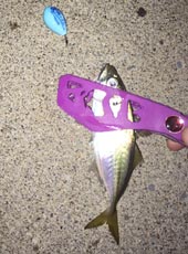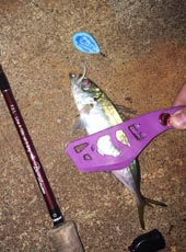 そこで、気になってたアルカジックジャパン・ぶっ飛びロッカーのアジキャロで沖を直撃してみました!! 扱いやすいかなーと思ってF/0(ジグヘッドの重さで沈下のタイプ)にバークレイ・アジデントの1gをセットしてキャスト! ジグ単(ジグヘッド単体)の3倍?4倍?とりあえず3〜40mは飛んでました。 そこからテンションフォールさせてるとガツンとあたりが! 1ポンドのラインに合わせてあるドラグをチリチリと出して上がって来たのは20cmには一歩届かないけど、丸っとしたナイスアジ! そして2連チャン! 雨がちらついて来たので、すぐに車に退散!! コレは楽しいですね!!