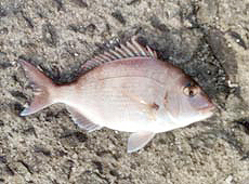7gテキサスにベイトブレス・フィツシュテイルリンガー2.8インチをセット。 ボトムバンプで狙っていると「コツコツ」とショートバイト。 何とかフッキングに持ち込め上がってきたのは何とびっくり20cmほどのマダイ!ショートバイトの正体はコイツだった様子。 その後、同じパターンでもう1匹追加!小型でしたがナイスファイトでした! !