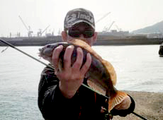 サトシン君にヒットしたの40アップの良型アブラコ(アイナメ)!船道となる潮の流れが早いエリアを狙いゲット!