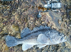またまた日本海側へ行ってきました! 前回は漁港でしたが、今回は磯場へ入釣。 21gテキサスリグ+バークレイ・パルスワーム4インチ チェリーキャンディーシードシルバーフレークをチョイス。 沖目にキャストし、リフト&フォールで狙っているとフォール中にバイト! ヒット後、強烈なファイトで楽しませてくれたのは40アップのクロソイ! 前回に引き続き40アップキャッチ!